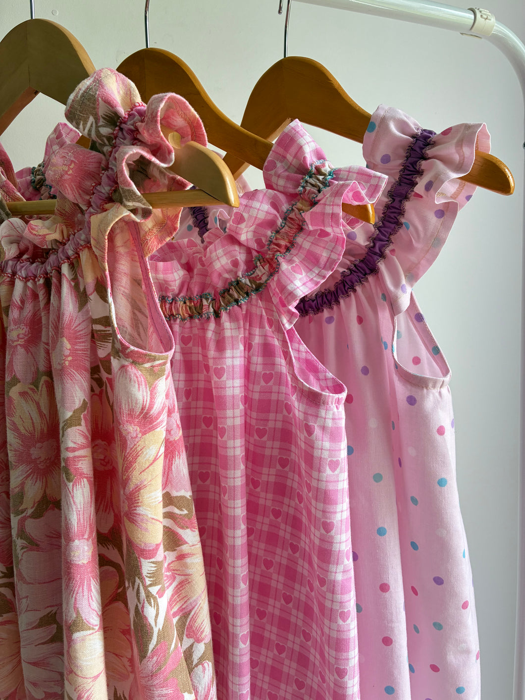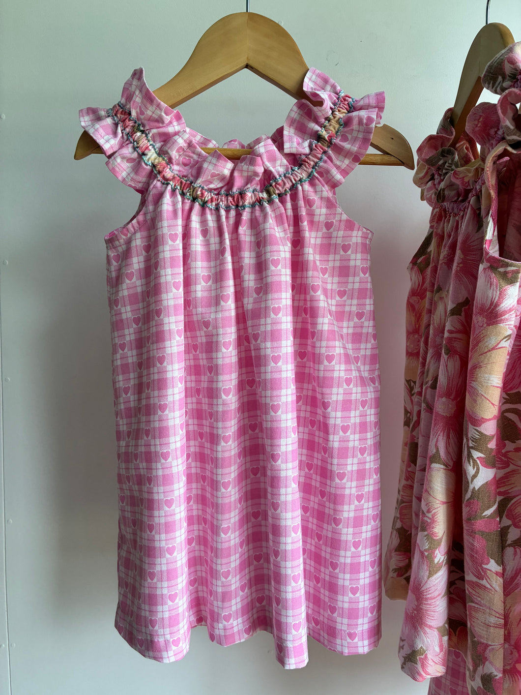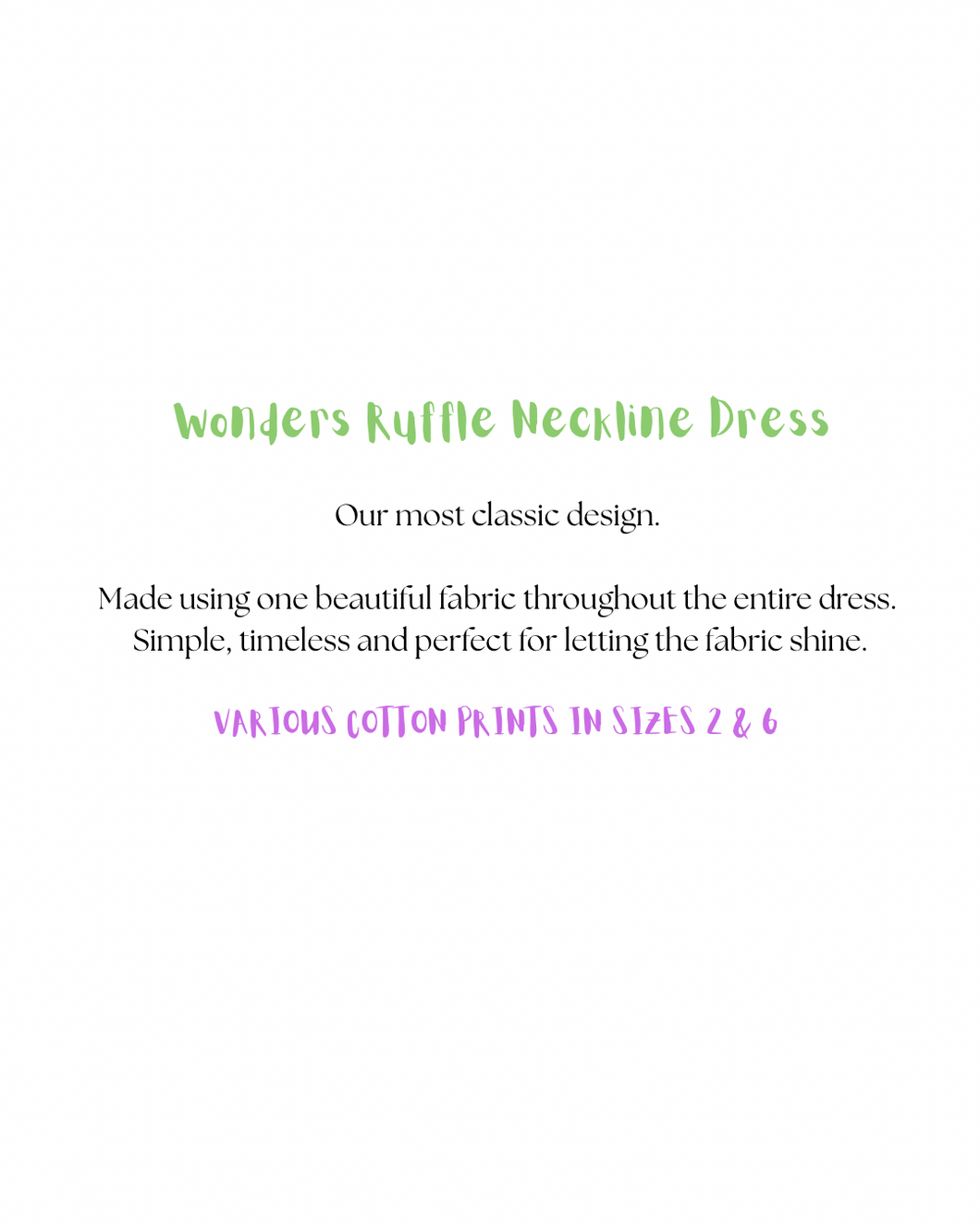 Our Wonders Ruffle Neckline Dress celebrates the beauty of a single fabric. Unlike our Whimsy Lou designs, which feature playful paneled fabrics, the Wonders dress is crafted entirely from one carefully chosen cotton, allowing the colour and texture of the fabric to shine.