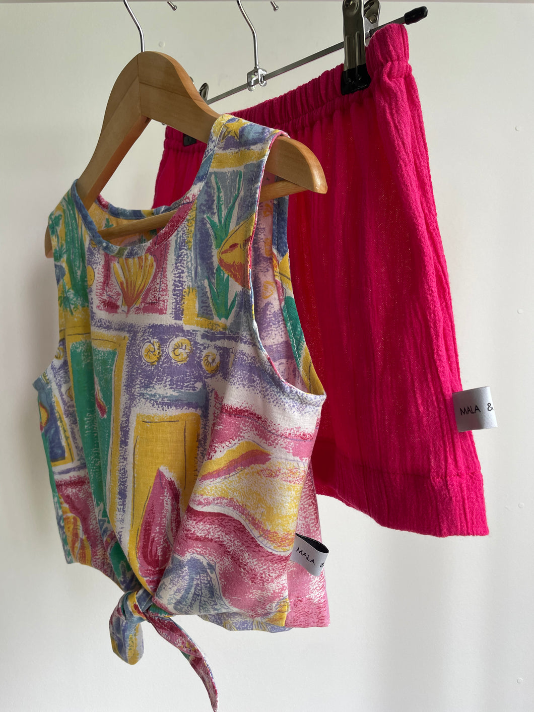 Paired with vibrant hot-pink crêpe shorts, this set is both practical and fun. The shorts feature a soft elastic waist for easy all-day comfort — perfect for running to the waves, climbing trees, or picnicking under the sun.