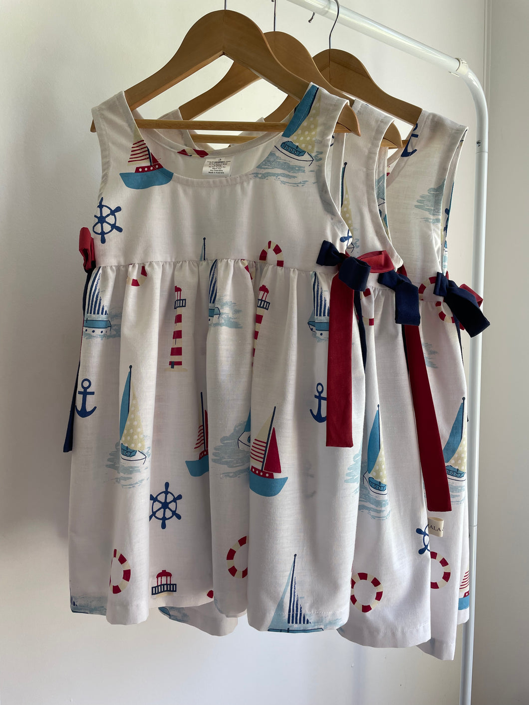Sail into summer with this timeless nautical print pinafore, crafted from upcycled soft cotton featuring boats, anchors, and seaside charm.