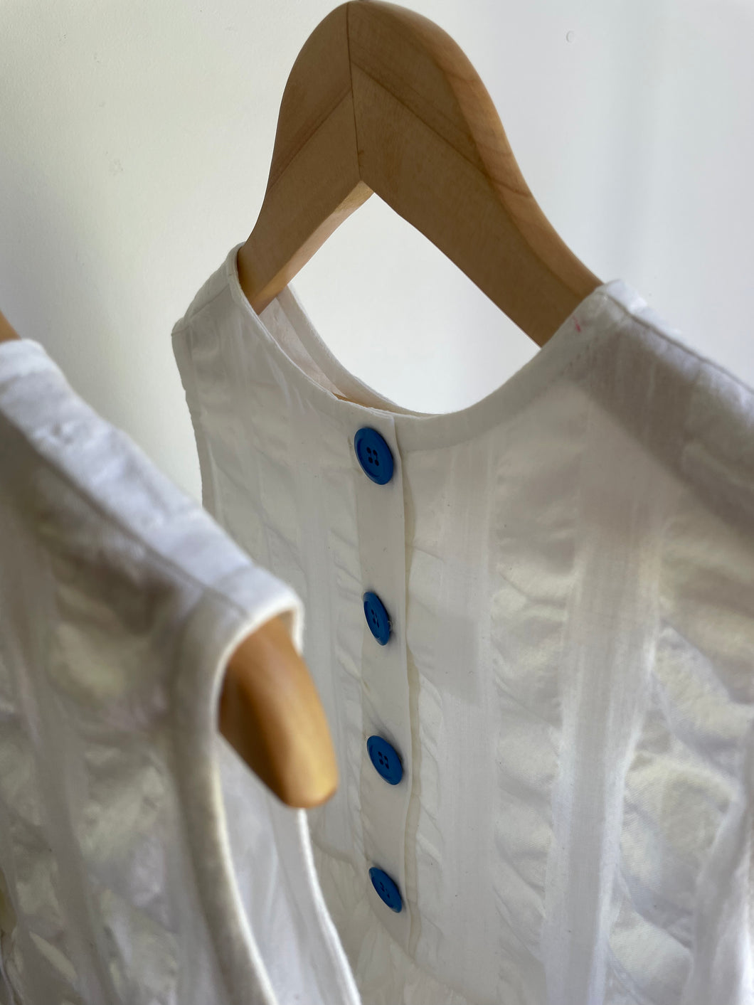 Featuring a button-back detail in ocean blue and soft side ties, it brings just the right mix of vintage charm and resort ease. The gathered skirt falls beautifully from the bodice, giving it that dreamy fullness that twirls with every seaside breeze.